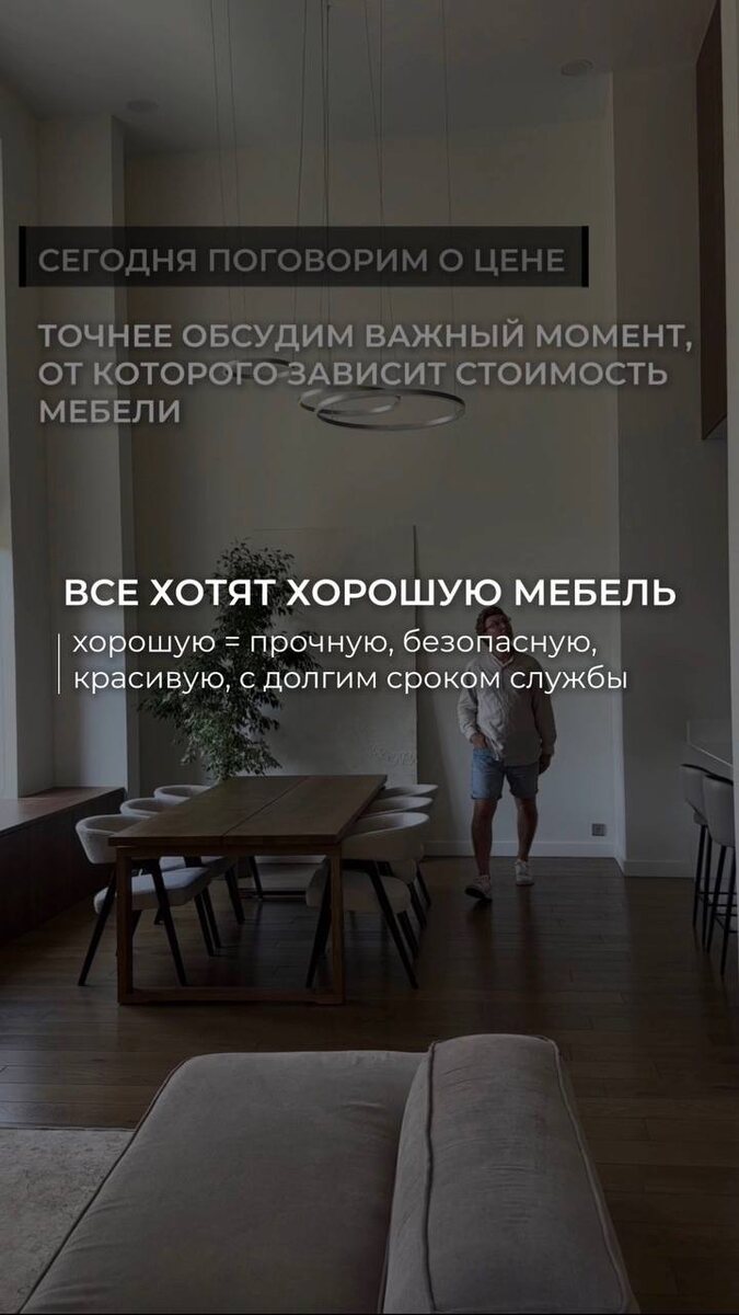 Про цены. И почему “дёшево” — это не про мебель. Частый вопрос, который мне задают: «А сколько стоит кухня / шкаф / гардеробная?» Честный ответ — цена не берётся из прайса. Она складывается из решений, которые вы выбираете на старте. Что реально влияет на стоимость: — конструкция и геометрия — материалы корпуса и фасадов — фурнитура и механизмы — типы открывания — панели, интеграции, стыковки с интерьером — требования к аккуратности и сроку службы Две визуально похожие кухни могут отличаться в цене в полтора–два раза — и это нормально. Я не работаю по принципу «вот базовый вариант, а дальше доплаты за всё». Сначала мы: — понимаем задачу — подбираем решения в разных сегментах — смотрим, где есть смысл вкладываться, а где — нет И только потом формируется стоимость. 👉 Поэтому у меня нет “цены за метр” или “типового прайса”. Зато есть прозрачный расчёт и понятная логика, за что именно вы платите. 📌 Все ключевые материалы и навигация по каналу — в закреплённом сообщении: 👉 http