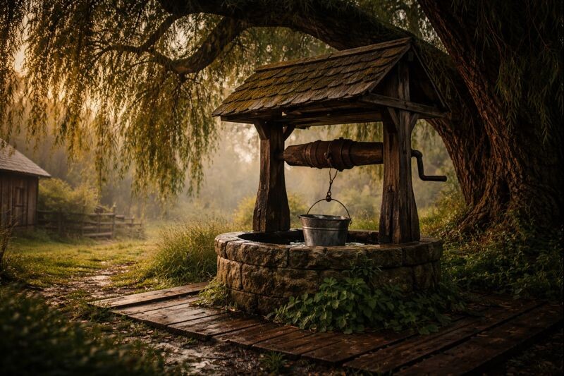 В деревне его знали все. Колодец стоял чуть в стороне от дороги, под старой ивой, которая скрипела по ночам так, будто вздыхала вместе с теми, кто не спал. Доски вокруг были потемневшие, верёвка — лоснящаяся от сотен ладоней, а ведро — тяжёлое, железное, с вмятиной на боку.