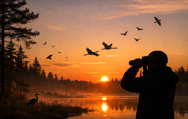 Лучшее время для наблюдений — раннее утро. На рассвете птицы наиболее активны: поют, ищут корм, ухаживают за партнёрами. Вечером тоже можно увидеть и услышать много интересного, но утро — идеальный момент. Сезонная динамика также важна: конец мая – начало июня считается пиком бердвотчинга, когда перелётные птицы вернулись и активно обустраивают гнёзда. Тем не менее наблюдать можно круглый год: зимой на кормушках появляются дятлы и синицы, а осенью радуют пролётные стаи гусей и журавлей.
