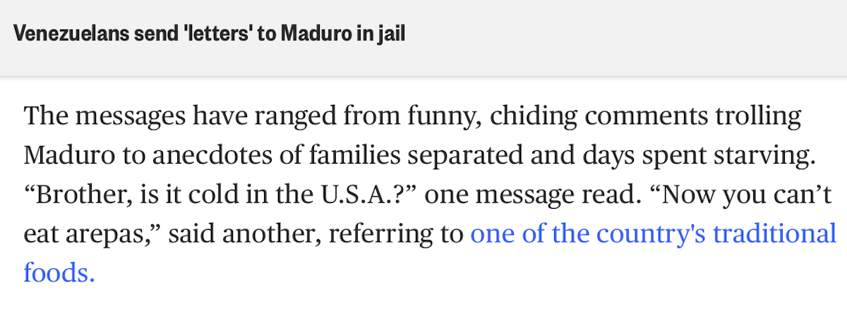 «Теперь ты не можешь есть арепас», — пишут венесуэльцы Николасу Мадуро в американскую тюрьму, имея в виду традиционное национальное блюдо.