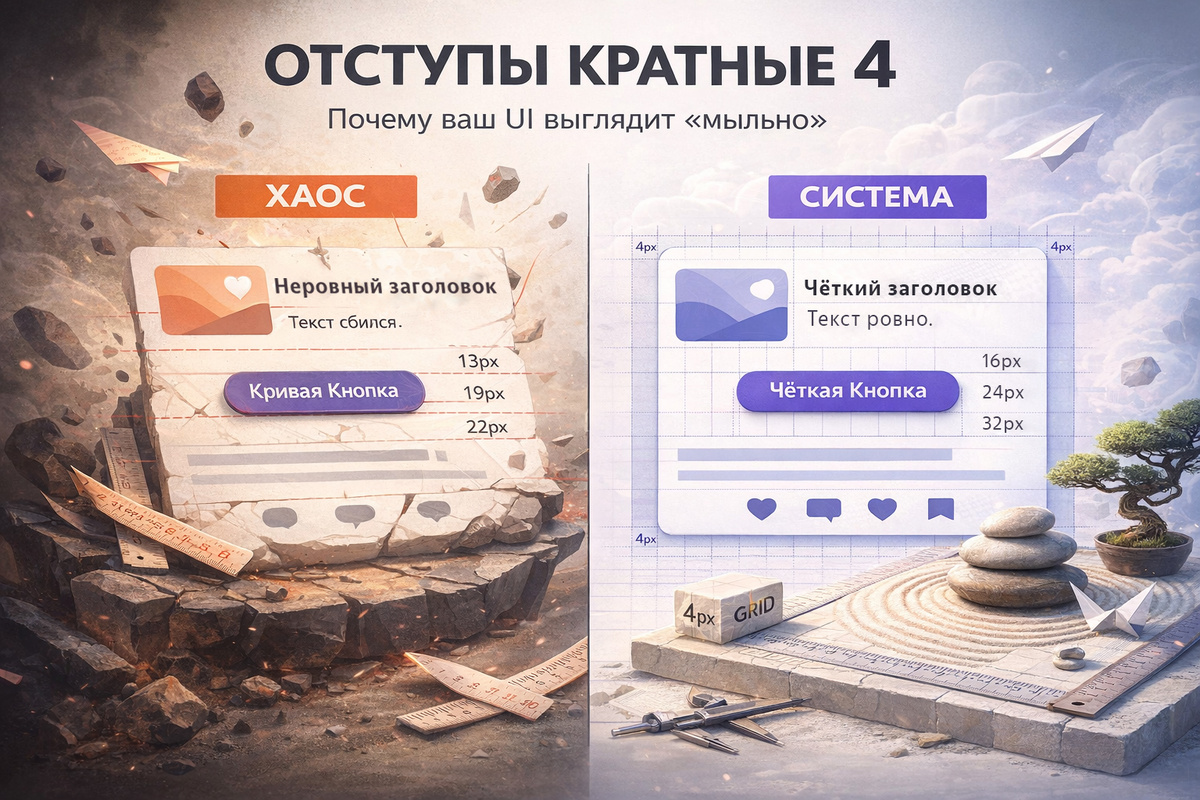 Большинство экранов и CSS-систем живут в 4px / 8px логике: 4 px — минимальный атом, меньше шум. Ты не видишь проблему — но мозг её чувствует. Если дизайнер ставит «рандомные» отступы: программист получает: margin: 13px 17px 22px 19px; Если всё кратно 4: margin: 16px 24px; Если завтра: кратные 4 масштабируются, а случайные — ломаются. 4 | 8 | 12 | 16 | 24 | 32 | 40 | 48 | 64 (но 4px остаётся атомом) 8 — мелкие отступы