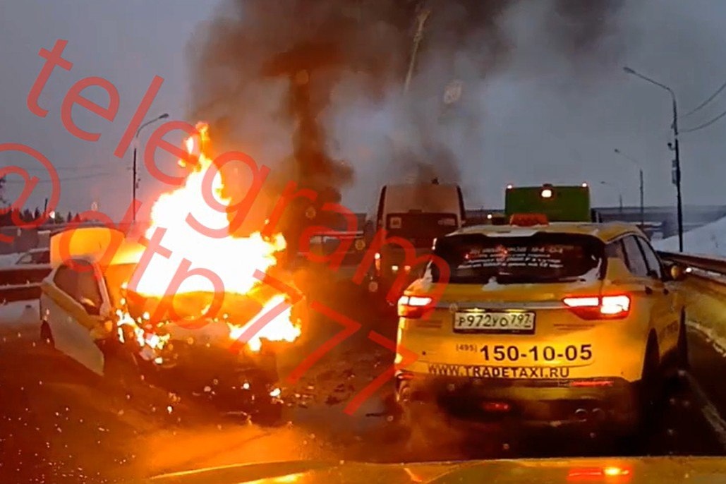 Автомобиль такси сгорел после столкновения с автобусом, пострадал один человек