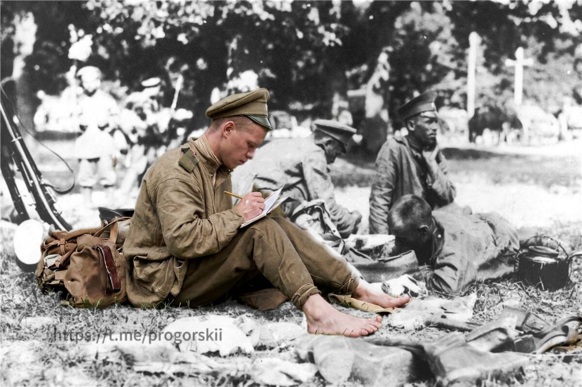 Русский солдат пишет письмо домой. Первая Мировая война. 1914 года