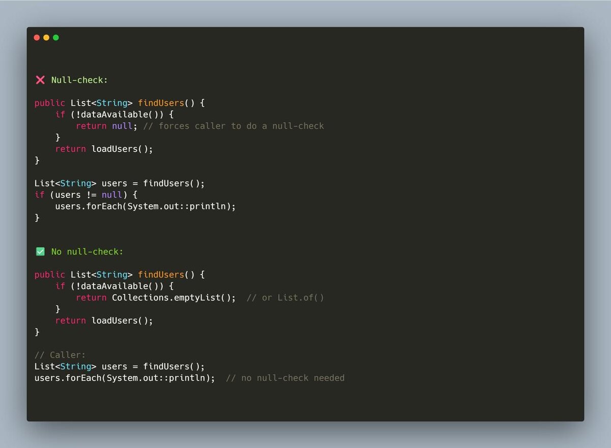 Если метод возвращает null, вызывающему коду приходится делать бессмысленные проверки - и это источник багов. Лучше всегда возвращать пустую коллекцию: - Collections.emptyList() - List.of() - Set.of() Тогда вызов становится безопасным, а код чище. Пример: ❌ Плохо (придётся проверять на null): public List<String> findUsers() { if (!dataAvailable()) { return null; } return loadUsers(); } ✔️ Хорошо (без лишних проверок): public List<String> findUsers() { if (!dataAvailable()) { return Collections.emptyList(); } return loadUsers(); } Теперь вызов можно писать так: List<String> users = findUsers(); users.forEach(System.out::println); // без null-check @javarush
