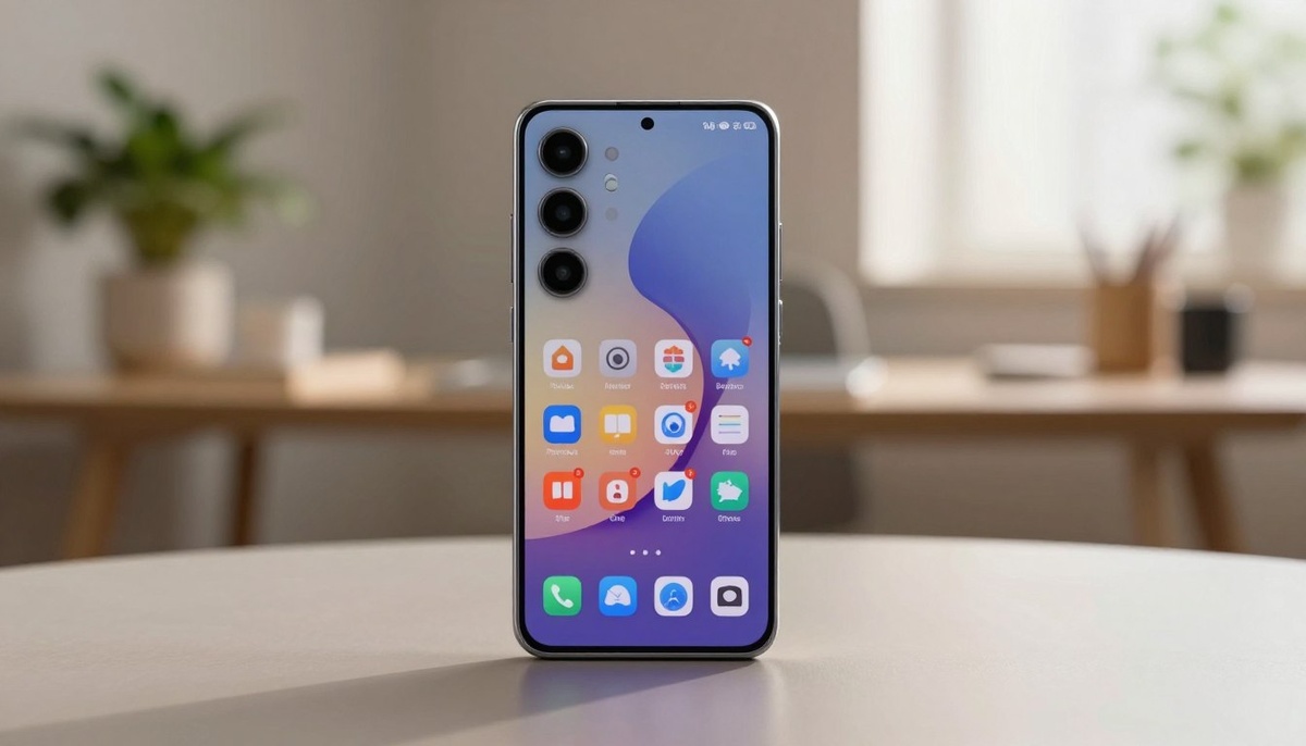 A sleek Samsung Galaxy S24 FE smartphone in graphite color, prominently displayed in the foreground on a polished wooden surface. The device features a slim profile with rounded edges and a vibrant display showcasing colorful app icons. The background is softly blurred, suggesting a modern office environment with a hint of natural light coming through a window, creating a warm and inviting atmosphere. A subtle reflection of the phone can be seen on the surface, enhancing its elegance. The angle captures the device from slightly above, emphasizing its design and ergonomic curves. The overall mood is professional yet stylish, highlighting the sophistication of the Samsung Galaxy S24 FE.