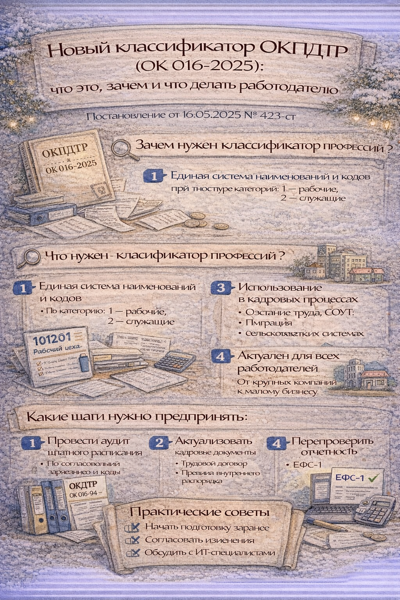С 1 января 2026 года в России вступает в силу новый Общероссийский классификатор профессий рабочих, должностей служащих и тарифных разрядов — ОК 016-2025 (ОКПДТР), утверждённый Приказом Росстандарта от 16.05.2025 № 423-ст. Он заменит устаревший классификатор ОК 016-94, действовавший почти 30 лет. Классификатор — это не просто справочник кодов. Он становится фундаментом для кадрового учёта, расчёта заработной платы, компенсаций, тарифных категорий и иных финансовых параметров, связанных с трудовой деятельностью. Новый классификатор выполняет сразу несколько ключевых задач: Каждой профессии и должности присвоен уникальный шестизначный код, где первая цифра определяет категорию (1 — рабочий, 2 — служащий), а остальные — порядковый номер в классификаторе. Это упрощает автоматизированную обработку данных в кадровых и бухгалтерских системах. ОКПДТР синхронизирован со смежными справочниками: В новую редакцию включены современные должности, отражающие реалии рынка труда: специалисты по цифровы