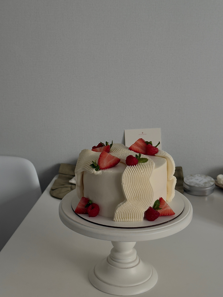 Наносим по середине через насадку 1 узор на протяжении всего торта и 2 небольших узора по бокам (делаем из волной, чтобы тортик смотрелся интереснее) 🙌🏻