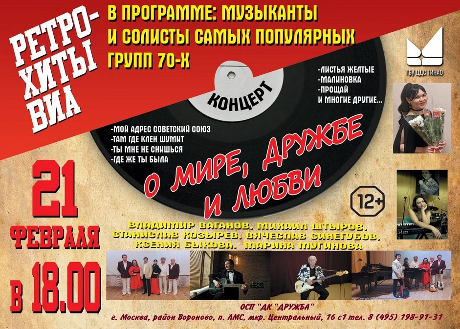 » ✨ Дорогие друзья! Приглашаем вас на встречу с настоящим искусством. В программе примут участие профессиональные музыканты и экс-солисты прославленных вокально-инструментальных ансамблей СССР. 🎭🎶 Особенности концерта: • Только живой звук: честное исполнение и живая энергия инструментов. • Легендарный репертуар: в программе прозвучат хиты «Мой адрес — Советский Союз», «Прощай», «Там где клен шумит…», «Малиновка», «Листья желтые…» и многие другие незабвенные композиции той эпохи. • Душевность: артисты поделятся интересными историями создания любимых песен. 🎟 Билеты онлайн: https://iframeab-pre4796.intickets.ru/seance/69649489/#abiframe А также билеты можно приобрести в «ДК «Дружба». Профессионализм исполнителей и всенародно любимые хиты подарят вам заряд положительной энергии и незабываемые впечатления. Приходите за вдохновением и праздничным настроением! 🌟👏 #анонсывороново #анонсытинао #новоститинао