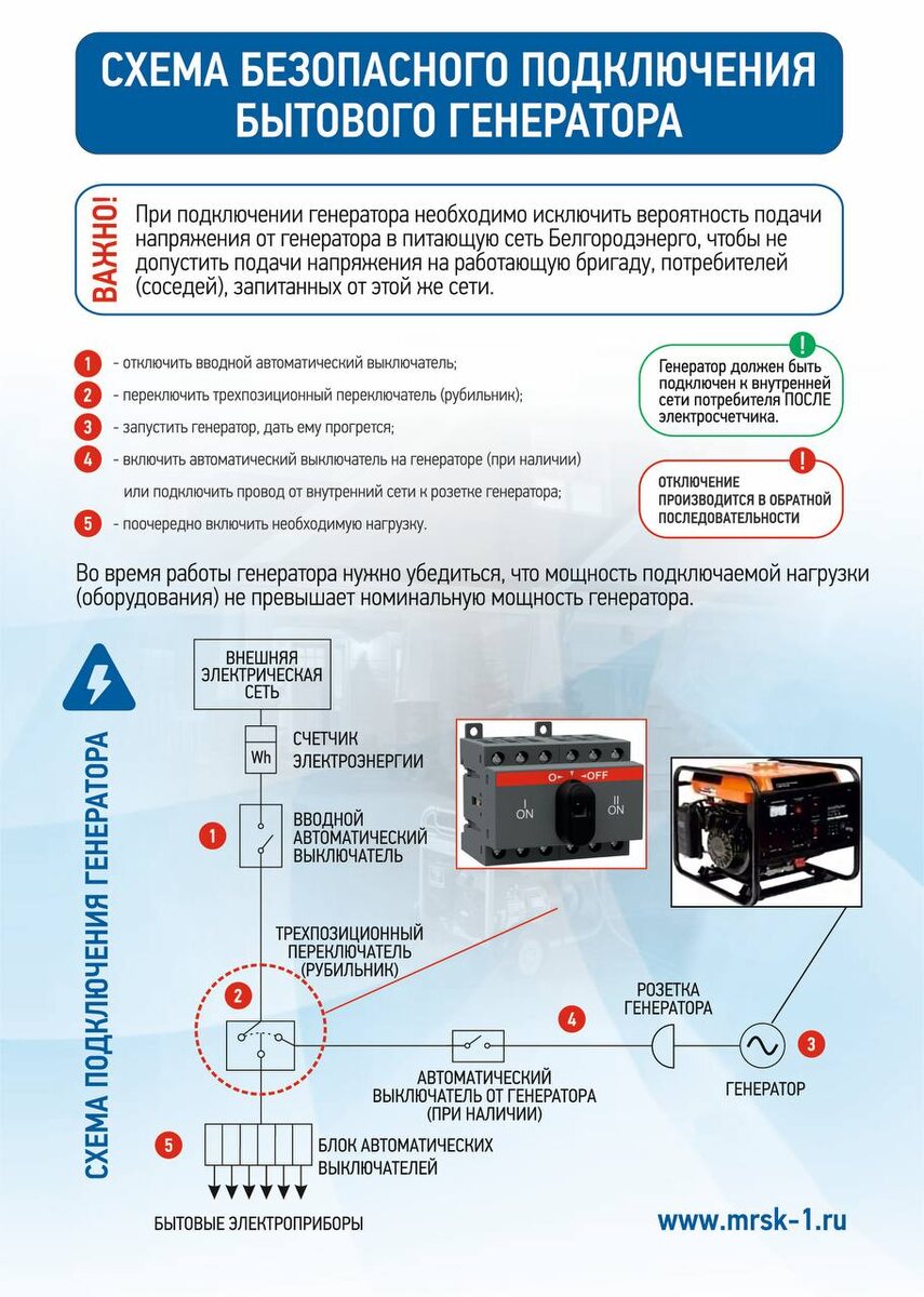 ? Энергетики напомнили белгородцам правила безопасного использования домашних генераторов. Главное — подключайте генератор только после электросчётчика. Если подключить до счётчика, он может посчитать ваше собственное электричество как потреблённое из сети, и вы получите большой платёж. Как подключить безопасно: 1. Отключите общий автомат в доме (чтобы ток от генератора не ушёл в сеть). 2. Отключите все приборы от розеток. 3. Запустите и прогрейте генератор. 4. Подключите домашнюю сеть к генератору через подходящий по мощности удлинитель. 5. Включайте приборы по одному, чтобы не перегрузить генератор. Важно: генератор должен стоять в сухом, проветриваемом месте подальше от дома. Нарушение этих правил опасно: может привести к пожару, отравлению угарным газом или поражению током. Также это угрожает жизни ремонтных бригад, которые работают на линиях. #новостикомпаний