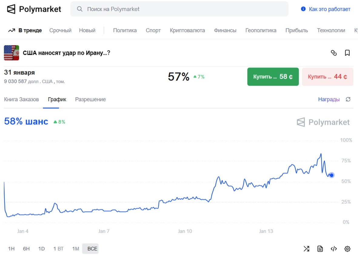 13 января писал: При этом Трамп не может себе позволить начать полноценную военную операцию против Ирана. Ему уже хватило скандала с Венесуэлой, когда несколько республиканцев в Сенате встали на сторону демократов и запретили ему дальнейшие военные действия против этой страны. Текущая тактика Трампа до выборов в Конгресс – это короткие успешные удары. Длительные операции без гарантий на успех он себе позволить не может. Без наземного вторжения, одними авиаударами, США не в состоянии сменить власть в Иране на проамериканскую. Поэтому в текущий момент я не вижу логики в таких ударах США. 14 января Reuters, со ссылкой на европейских чиновников, сообщило, что США могут нанести удар по Ирану в течение 24 часов. Затем Трамп заявил, что убийства в Иране прекратились и казней в планах нет. На платформе ставок Polymarket, шанс удара США по Ирану доходил до 85%. Пользуйтесь товарищи иностранцы (где-то 350 подписчиков ТК), для россиян любые ставки, кроме спортивных, запрещены ФЗ № 244-ФЗ