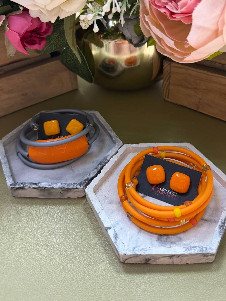 🔥 Каучук здесь — как чистая линия: гибкий, матовый, уверенный. Муранское стекло добавляет характер — тёплый оттенок, лёгкий блеск, ни одной случайной детали. Два браслета и серьги — можно подбирать разные комбинации или играть на контрастах. Эти украшения особенно хорошо работают с базой: белая или черная рубашка, кашемир коричневых тонов, деним. 👌🏻 Браслет серый 2850 Браслет рыжий 2700 Серьги 1050 ✨Нажмите для заказа ✉️ Нажмите чтобы задать вопрос