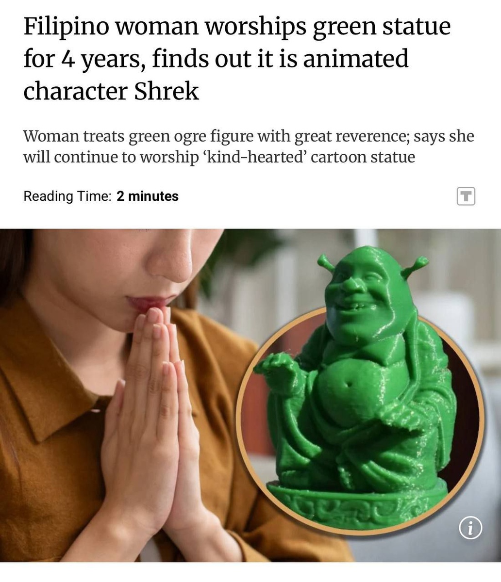 ! Женщина четыре года молилась Шреку, спутав его с богом веселья и благополучия Хотэйем. Правда вскрылась случайно: о том, что у филиппинки на алтаре стоит огр Шрек ей рассказал друг. За святой образ она приняла статуэтку из-за соответсвующей позы, большого живота и счастливого лица. Ещё чуть-чуть и образовалась бы новая религия. Годное!😉😂 #нестраховка
