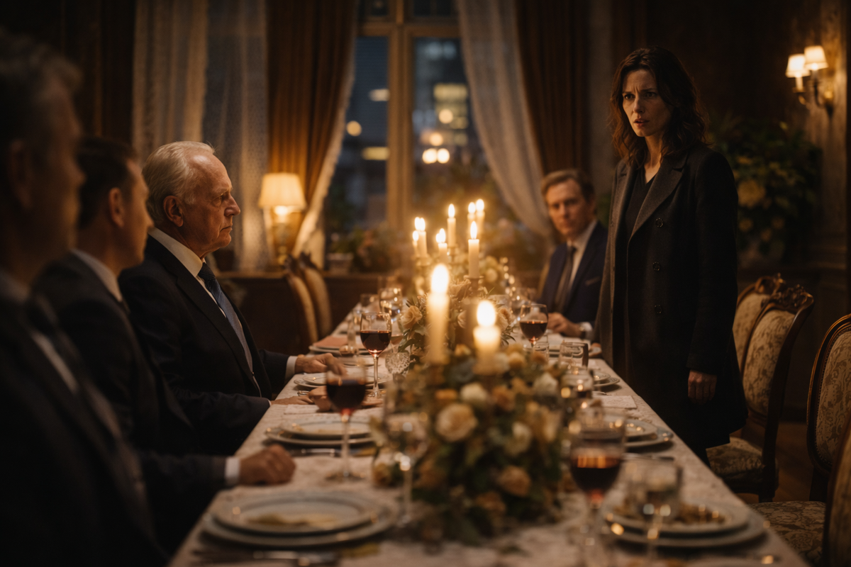 Все головы повернулись к Вере. Кристина — красивая, холодная, в чёрном платье — смотрела с презрением. Олег побледнел и вцепился в край стола.