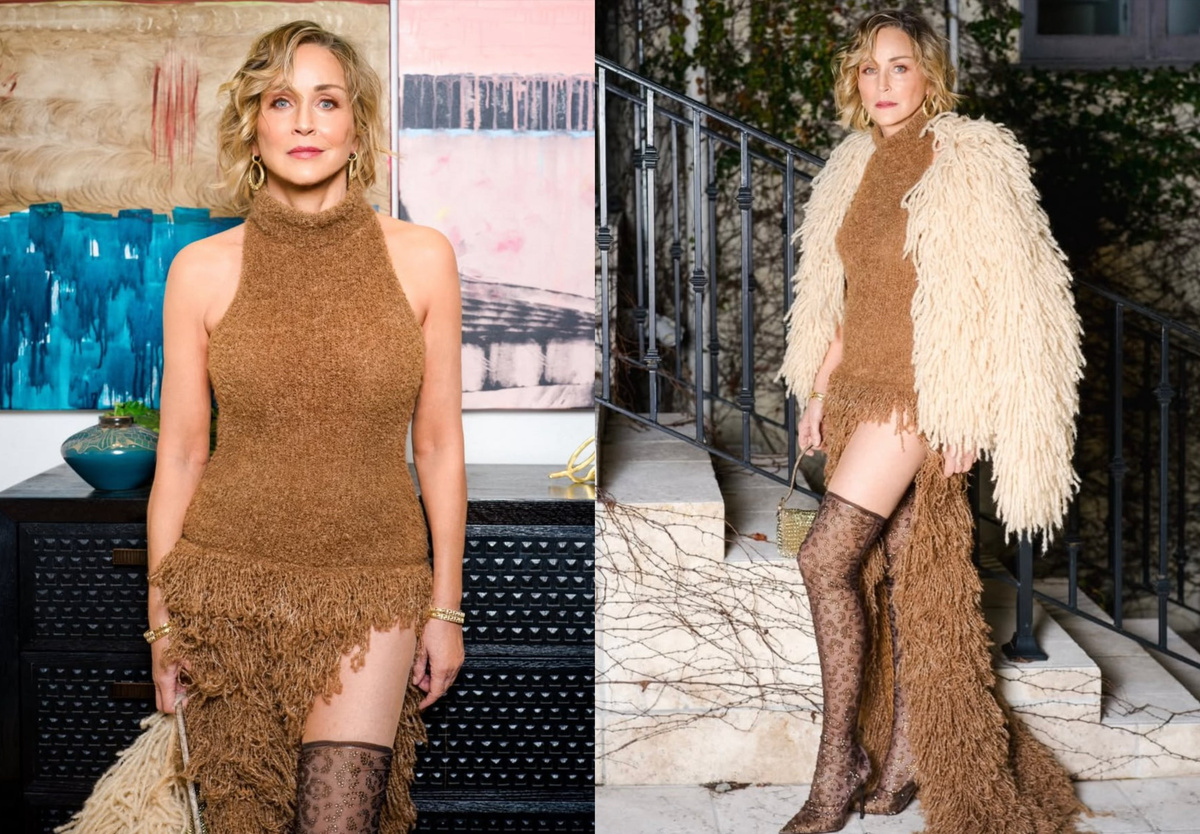 Появление Шэрон Стоун всегда ждут с особым интересом. Каждый её выход становится событием, которое долго обсуждают в Голливуде, но на этот раз разговор вышел далеко за пределы модных колонок. Интрига возникла не только вокруг одежды, но и вокруг самой Шэрон Стоун, её внешности и того, как именно она сегодня выглядит. На красной дорожке актриса появилась в карамельном платье из вязаного трикотажа с активной бахромой и глубоким разрезом, который сразу стал главным визуальным акцентом образа. Платье плотно сидело по фигуре, подчёркивая силуэт, а воротник стойкой без рукавов и заниженная линия талии читались как счастливая и очень узнаваемая отсылка к культовому белому платью водолазке из «Основного инстинкта». Только теперь эта цитата звучит гораздо смелее. Под разрезом оказались леопардовые чулки, элемент, который моментально разделил публику. Для одних это откровенный эпатаж, для других фирменная ирония Шэрон Стоун, которая никогда не боялась играть с границей дозволенного. Леопардовый