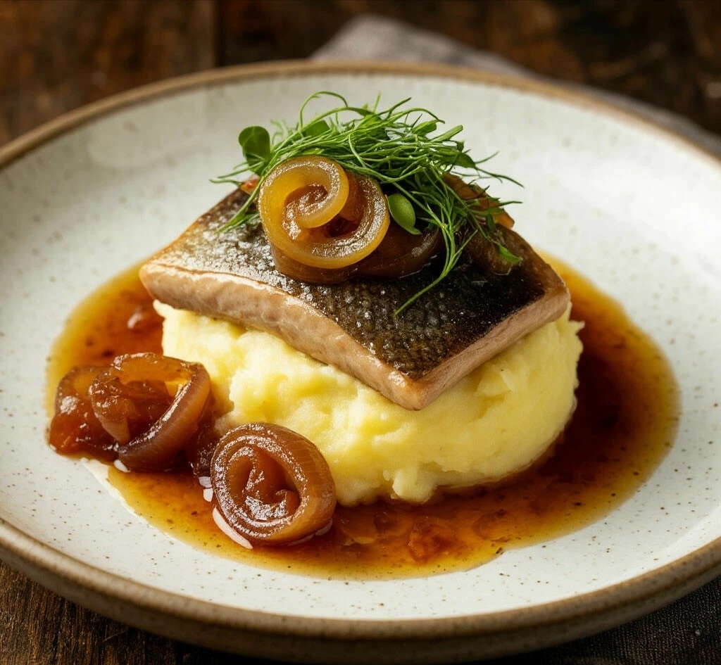 5. Подача: На тарелку горкой выложить картофельное пюре. Рядом положить стейк сельди. Сверху на рыбу или рядом выложить щедрую порцию лукового конфи.
