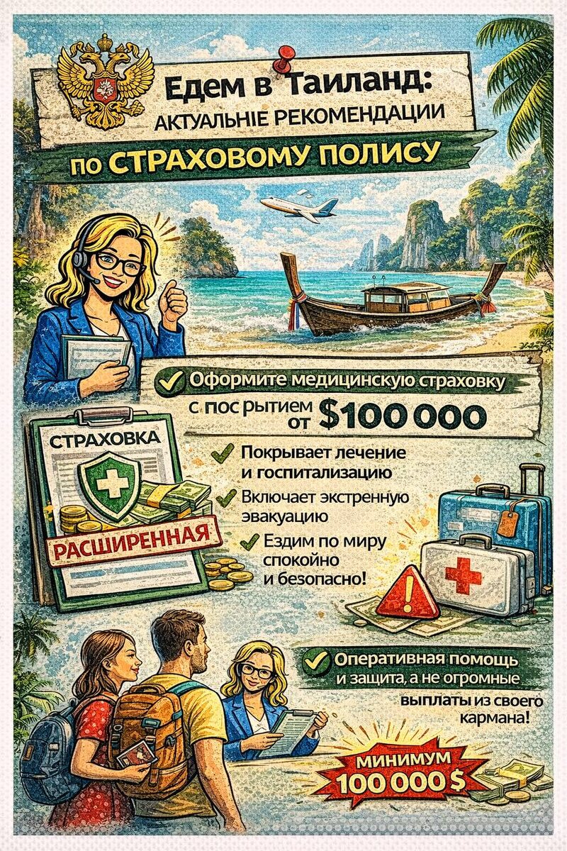 : актуальные рекомендации по страховому полису ✅В телеграм-канале Посольства России в Таиланде опубликованы актуальные рекомендации для туристов, собирающихся в королевство. ⚡️Акцент – на важности оформления перед поездкой в эту страну расширенной медицинской страховки, желательно с покрытием не менее 100 тысяч долларов. Обращение посольства связано с недавними тревожными событиями в Таиланде с участием граждан России. В частности, на пути к островам Пхи-Пхи произошла авария скоростного катера, в результате которой погибла 18-летняя девушка и 23 человека получили травмы и были госпитализированы. Отправляясь в отпуск, мы не знаем, с какими непредвиденными ситуациями можем столкнуться. Но наличие действующего страхового полиса с хорошим покрытием позволит не только оперативно получить необходимую медицинскую помощь, но и покрыть расходы на лечение, госпитализацию или экстренную эвакуацию и снизить финансовые риски – а они существенные: ➡️один день госпитализации в Таиланде с
