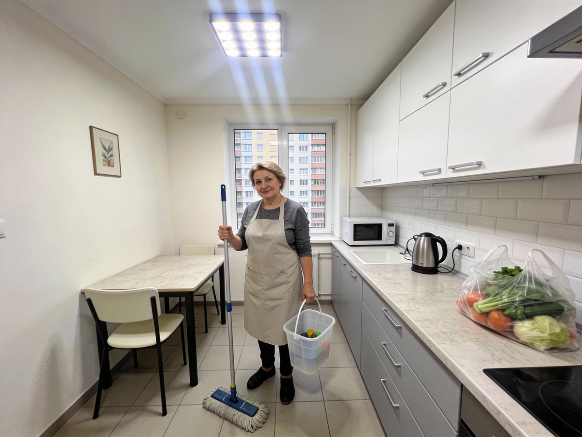 Пришла с работы — дверь открыта настежь. Я замерла на пороге. В квартире пахло хлоркой. Кто-то мыл пол. — Алло? — крикнула я. Из кухни вышла свекровь. В моём фартуке. С ведром в руках: