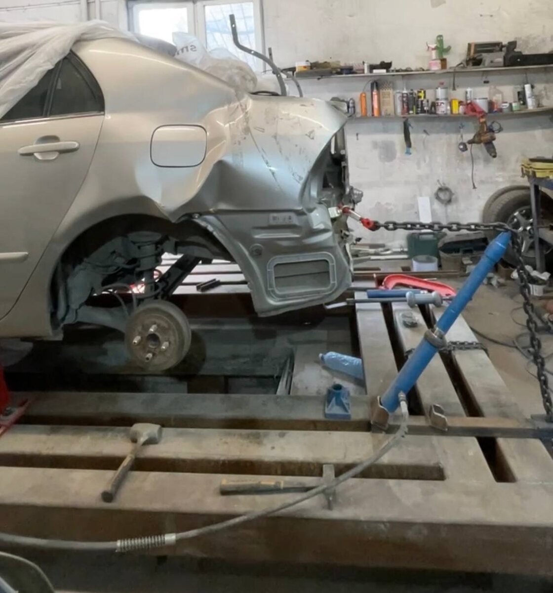 Первым делом нужно вытянуть лонжерон и восстановить геометрию кузова.