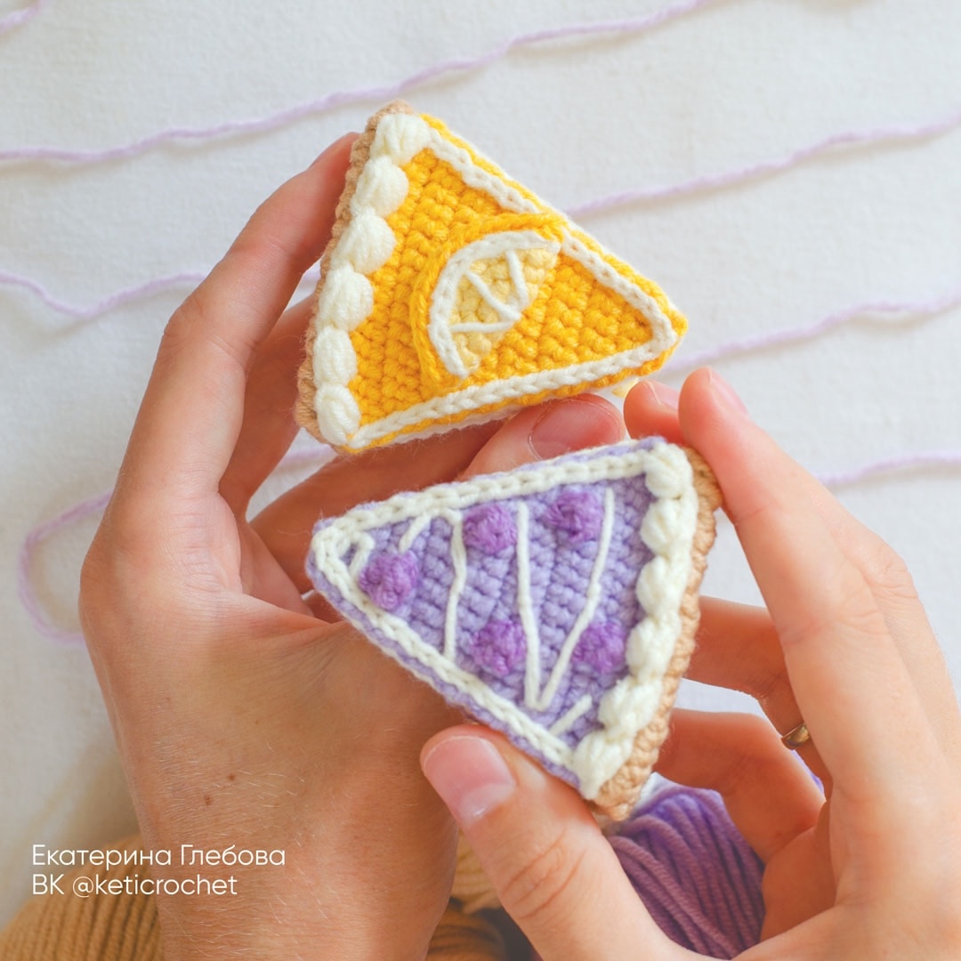 Техника: поворотные ряды и по кругу Длина игрушки около 7 см, толщина около 2 см. Плотность вязания, натяжение нити, толщина пряжи, размер крючка влияет на размер готовой игрушки. Описание содержит 2 варианта оформления. Игрушка маленькая, задумывалась, как елочная игрушка. Но при желании сделайте брелок или свяжите ассорти из кусочков с разными начинками. Этот набор будет интересен для девочек, если они любят играть в игры, связанные с едой, например, кафе, кулинар. Если вяжете елочную игрушку, то внутрь можно положить что-то ароматное, например, палочки корицы или добавить эфирное апельсиновое масло. Крючок №2