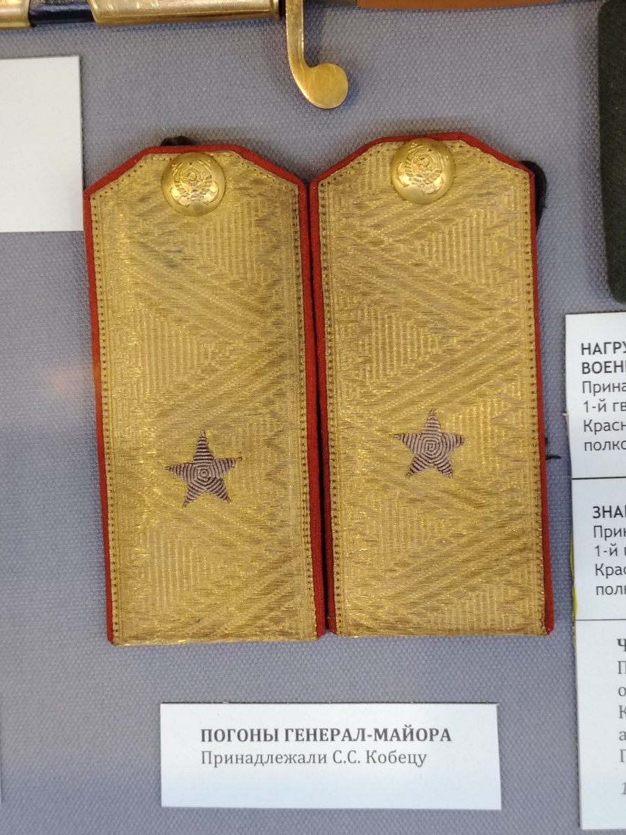 Представляем экспонат из Центрального военно-морского музея им. Петра Великого в Санкт-Петербурге. На этих погонах образца 1943 года использованы морские адмиральские пуговицы, что было предусмотрено для частей, которым полагалась сухопутная форма одежды (соответствующие приказы мы уже публиковали ранее). Исторический контекст: в мае 1944 года Кобец был назначен командиром 1-й гвардейской морской железнодорожной артиллерийской бригады Балтийского флота. Интересная деталь: на пуговицах можно увидеть 11 лент. Это соответствует изображению на гербе СССР до 1946 года, где также было 11 лент. По имеющимся данным, звание генерал-майора Кобец получил в 1951 году. Однако это не исключает возможности ношения таких пуговиц в более поздний период или их размещения в музейной экспозиции. Что вы думаете о таких исторических «головоломках» и нюансах в униформе? #СССР #ВоеннаяИстория #УниформаСССР #БалтийскийФлот #МузейныйЭкспонат