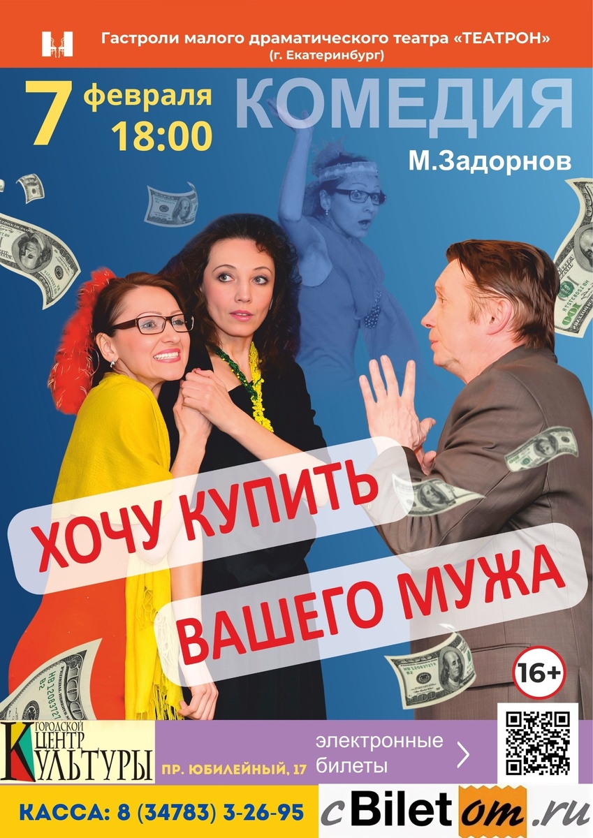 »🤩 📌07 февраля в 18:00 📍Городской центр культуры (г. Нефтекамск, пр. Юбилейный, 17) 🎭"ХОЧУ КУПИТЬ ВАШЕГО МУЖА" (16+) – умопомрачительная комедия в одном действии по пьесе всеми любимого, Михаила Задорнова 🌟-Яркий юмор, невероятные повороты событий и лёгкость повествования в духе Задорнова – спектакль подарит вам вечер смеха и размышления о любви и семейных ценностях🌟 💰Цена билетов: от 700 руб. 🎟Билеты в продаже: • Онлайн Cbiletom.ru (электронные билеты без комиссии!) — 👉 https://cbiletom.ru/event.php?event=11773 • В кассе Центра культуры / ☎Тел. 8-(34783) 3-26-95 👉 Подписаться на канал