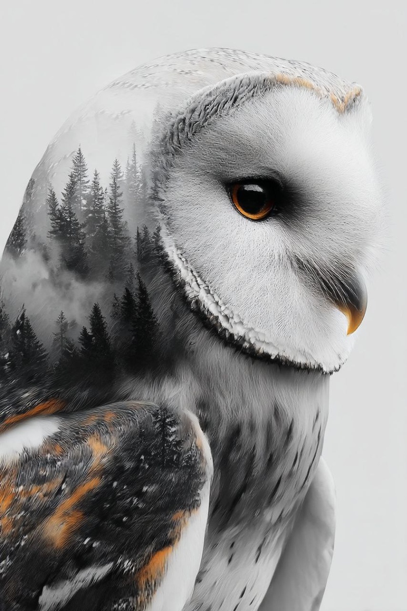 a black-and-white double-exposure illustration of an owl with a forest landscape on top, isolated against a plain background. --chaos 30 --ar 2:3 --raw --stylize 300 --draft