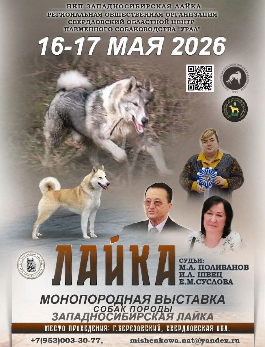В городе Берёзовском Свердловской области состоится выставка лаек западносибирских. Выставку будет проводить региональная общественная организация племенного собаководства "Урал". Судить будет опытный специалист, судья Швец Ирина Львовна из Москвы. На мероприятии планируется делать бонитировку, т.е. будет проводиться также рабочий класс, где будут учитываться все имеющиеся дипломы у собак!