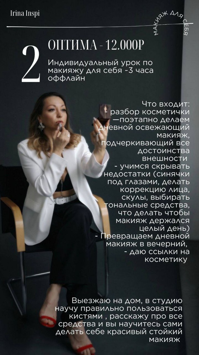 ✨ ❤️ Индивидуальный урок по макияжу для себя OПТИМА ~ 3 часа оффлайн Хочешь научиться создавать идеальный макияж самостоятельно, уверенно подчеркивать свою красоту и выделяться среди окружающих? Тогда этот формат урока как раз для тебя ✔️ ❤️Чем будем заниматься на уроке 💄Разберём твою косметичку 💄 Сделаем дневной макияж поэтапно, подчеркивая все достоинства и скрывая недостатки 💄Трансформируем дневной макияж в вечерний ❤️Индивидуальное занятие позволяет обсудить даже самые мелкие нюансы, возникшие трудности и проблемы, проверяя теорию сразу же на практике под моим руководством❤️ ❤️Стоимость индивидуального урока OПТИМА в январе и феврале у меня дома - 8.000₽ С выездом - 12.000₽ ✉️также есть сертификаты, этот урок вы можете преподнести в качестве подарка🩷 По всем вопросам и для записи, напишите мне @Airylife