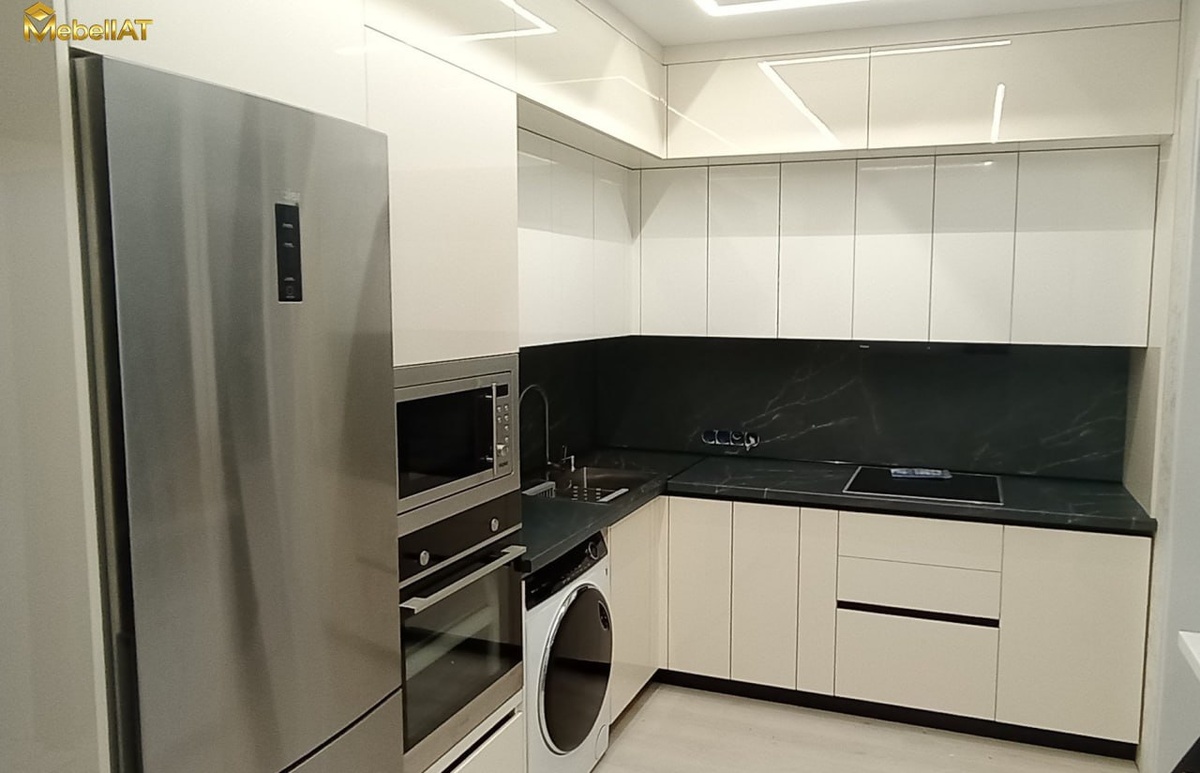 ☯️ Классическое сочетание черного и белого цветов - универсальный вариант👌🏻 Для небольшой кухни стоит заказать мебель, в которой больше будет белого цвета🤍 Светлые акценты позволяют визуально расширить ограниченное пространство🙌🏻 Выбор белых шкафов и черных фартука со столешницей - это оригинальное сочетание, способное придать интерьеру легкость и основательность одновременно🌌 Белые фасады верхних и нижних шкафов визуально расширяют пространство, а рабочая зона гарнитура — практичный вариант оформления, который скрывает брызги и прочие загрязнения после приготовления пищи😜 Установлена столешница из ламинированного ДСП Black de Oro 40мм, Slotex✅ Фасады выполнены из: МДФ в ПВХ плёнке Белый теплый глянец✅ МДФ в ПВХ плёнке Макиотти металлик глянец✅ Стеновая панель Black de Oro, Slotex✅ Установлена скрытая система ручек «Гола»✅ Установлена бутылочница с доводчиками✅ 320000руб💰 *Стоимость действительна на момент установки и без учёта техники Хотите узнать стоимость Вашей будущей