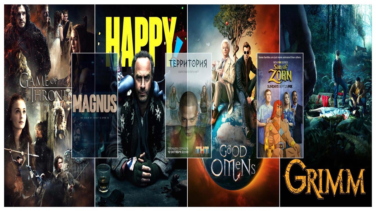 Игра престолов / Game of Thrones (2011 - 2019, США, Великобритания, фэнтези, приключения, 18+, кол-во сезонов: 8, кол-во эпизодов: 73, время эпизода: 55 мин., закрыт) Хэппи / Happy! (2017 - 2019, США, фэнтези, криминал, 18+, кол-во сезонов: 2, кол-во эпизодов: 18, время эпизода: 55 мин., закрыт) Благие знамения / Good Omens (2019 - …, Великобритания, США, фэнтези, комедия, 18+, кол-во сезонов: 2, кол-во эпизодов: 12, время эпизода: 55 мин., снимается) Гримм / Grimm (2011 - 2017, США, фэнтези, детектив, 18+, кол-во сезонов: 6, кол-во эпизодов: 123, время эпизода: 45 мин., закрыт) Магнус / Magnus (2019, Норвегия, фэнтези, комедия, 18+, кол-во сезонов: 1, кол-во эпизодов: 6, время эпизода: 30 мин., закрыт) Территория (2020 - 2023, Россия, фэнтези, мистика, 18+, кол-во сезонов: 2, кол-во эпизодов: 15, время эпизода: 50 мин., закрыт) Сын Зорна / Son of Zorn (2016 - 2017, США, фэнтези, комедия, 16+, кол-во сезонов: 1, кол-во эпизодов: 13, время эпизода: 30 мин., закрыт) Лучшие сериалы про св
