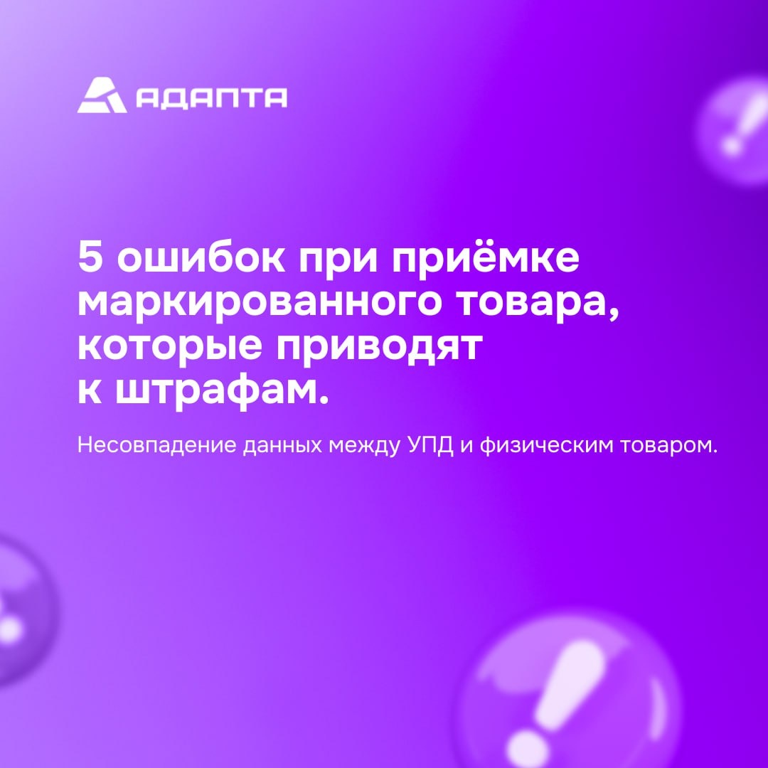 Ошибка при маркировке №2 — данные в УПД не совпадают с реальным товаром. Ситуация, которая кажется «мелкой»: в документе одно, на коробке — другое. На практике это может быть: — другой GTIN; — не те серийные номера; — расхождение по количеству / весу / упаковкам; — коды маркировки в УПД не совпадают с кодами на товаре. Для системы маркировки это считается серьёзным нарушением, потому что товар перестаёт корректно отслеживаться. ⚠️ Что за это бывает: — должностному лицу: до 10 000 ₽ — компании: до 300 000 ₽ 🛑 И самое неприятное — конфискация всего товара, по которому нашли расхождения. После конфискации товар может быть уничтожен. И важный момент, который часто недооценивают: ответственность несёт получатель, даже если ошибка возникла на стороне поставщика. В следующем посте — что делать, если код есть, но он не читается, и почему такой товар вообще нельзя вводить в оборот. #АДАПТАзнает