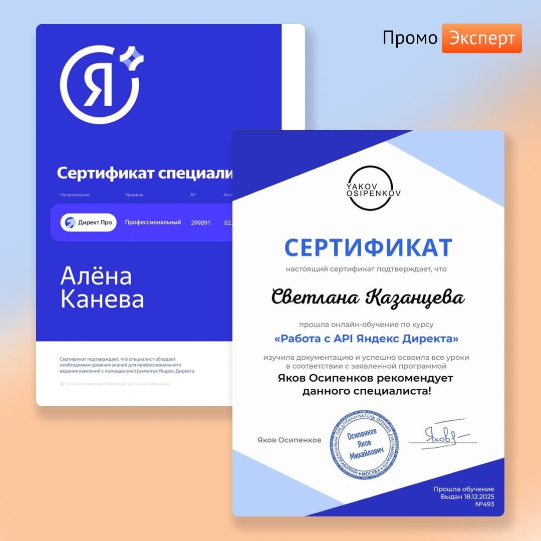 : 😀 Света прошла обучение по курсу «Работа с API Яндекс Директа» Благодаря этому обучению я научилась работать с API Директа, выгружать сырые данные и визуализировать их в Дата Ленс. Это помогает видеть точки роста и строить понятные отчеты для клиентов Света — рекордсмен. За 2025 получила 11 сертификатов 😌 😀 Алёна обновила сертификат по Яндекс Директу В этом году Яндекс активно работал над развитием и расширением функционала в Директе, и вместе с этим усложнил сертификационный тест. Вопросы стали хитрее: появились „подводные камни“, и теперь важно внимательно читать не только условия, но и формулировки ответов По традиции делимся кейсами: 😀 Настроили рекламу на челленджи школы трейдинга School Live, за 7 месяцев получили 2 468 регистраций по 631₽ и 122 продажи платных курсов 😀 За 3 года получили из контекстной рекламы 3 794 лида по 3 245₽ для дилера строительной спецтехники #про_промо_эксперт@promoexpert P.S. Оперативная помощь по рекламе здесь.