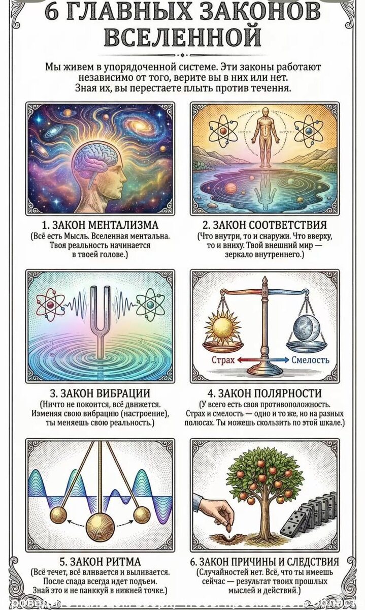 Знаешь это чувство? Мечта есть. Желание есть. А как будто “пусто”: не двигается, не складывается, не реализуется. Вчера я поймала свой ответ, когда готовила материал для тренинга: иногда дело не в “я недостаточно стараюсь”, а в том, что мы не учитываем законы, по которым работает жизнь. Один из самых недооценённых — закон задержки (времени): желание может быть очень правильным, путь — верным… но результат не приходит “по щелчку”. И вот тут появляется главный саботаж: нетерпение. Нетерпение часто делает две вещи: заставляет обесценить то, что уже сделано (“всё зря”), толкает на хаотичные действия (“быстрее-быстрее”), которые рассеивают энергию и фокус. Я прикрепляю картинку с 6 законами — и предлагаю маленькую практику на 3 минуты: ✅ Выбери одно желание, которое “не исполняется”. ✅ Посмотри на него через каждый из законов и спроси себя: — где я тороплю? — где я сомневаюсь? — где я делаю “рывками”, а не шагами? — где я жду результата, но не даю процессу времени? Напиши в коммента