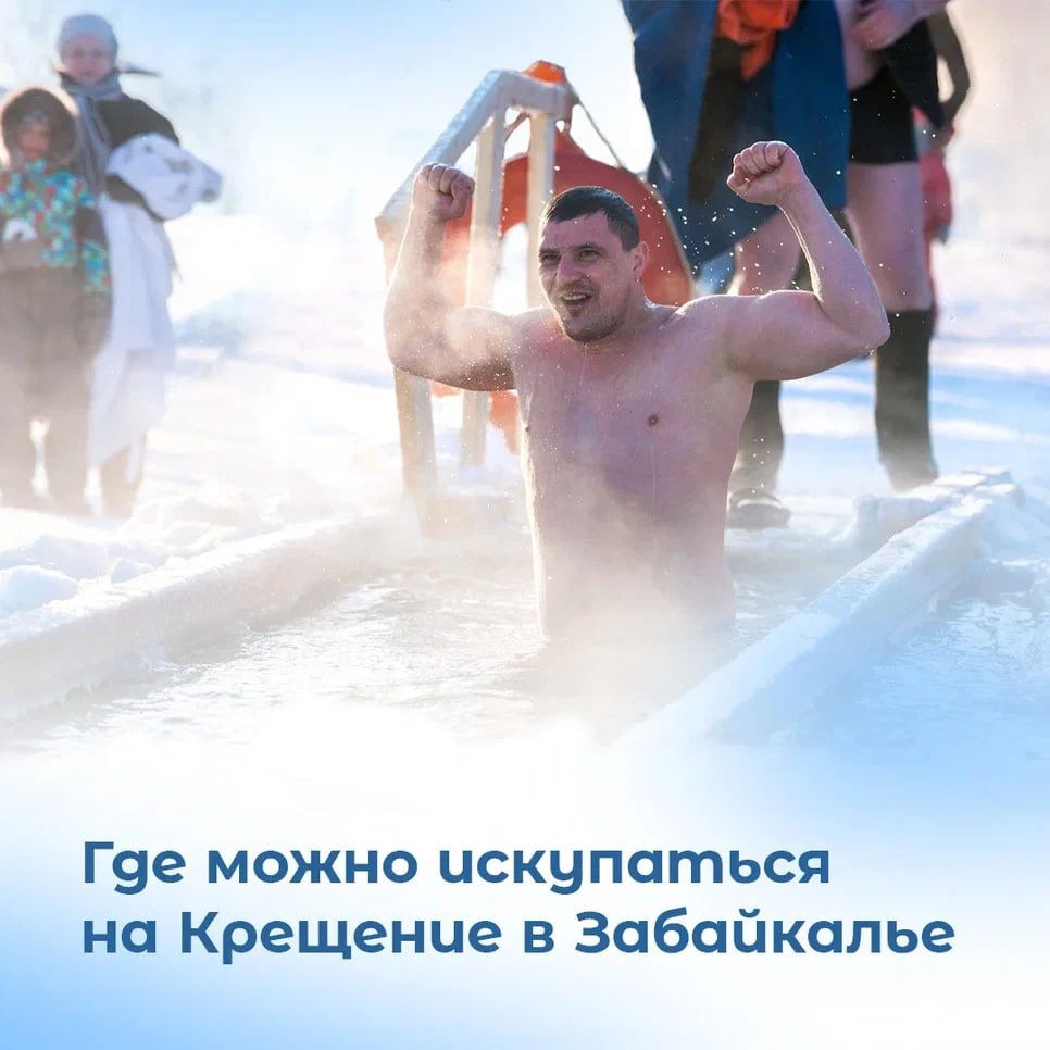 18 января в крае будут открыты 18 официальных прорубей. Везде будет организовано круглосуточное дежурство спасателей, медиков, инспекторов ГИМС и полиции. Главной площадкой в Чите станет озеро Кенон в районе базы Центра ГИМС. Окунуться в эту иордань можно 18 января с 18.00 и до 22.00 следующего дня Список всех мест для купания по округам: – Акшинский округ – река Онон, село Акша – Агинский округ – река Ага в районе 3-го моста, пгт. Агинское – Дульдургинский округ – два места: река Иля, село Дульдурга, мкр. Заречный река Иля, село Узон – Краснокаменский округ – обводненный карьер ПГС-1, г. Краснокаменск – Могойтуйский округ – река Ага, станция Остречная – Приаргунский округ – река Аргунь, село Новоцурухайтуй – Сретенский округ – река Шилка, пгт. Кокуй – Улетовский округ – река Ингода, село Улёты, местечко «Плашкоты» – Читинский округ – река Ингода, посёлок Маккавеево – Кыринский округ – река Кыра, село Кыра – Калганский округ – река Анчер, село Калга – Борзинский округ – озеро Мульда,