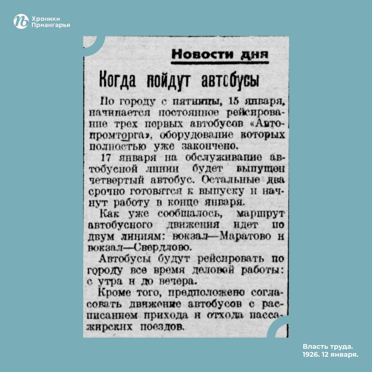 По этому случаю в одном из январских номеров газеты «Власть труда» была помещена заметка «Когда пойдут автобусы». В ней сообщалось следующее: «…маршрут автобусного движения идет по двум линиям: вокзал – Маратово и вокзал – Свердлово. Автобусы будут рейсировать по городу все время деловой работы: с утра и до вечера». По данным МУП «Иркутскавтотранс», созданная тогда Городская транспортная контора обслуживала Иркутск «небольшими автобусами марки ЗИС, грузовыми автомобилями и легковыми такси». © Использован материал ЭКБ «Хроники Приангарья»: Когда пойдут автобусы // Власть труда. – Иркутск, 1926. – 12 янв. (№ 8). – С. 8.