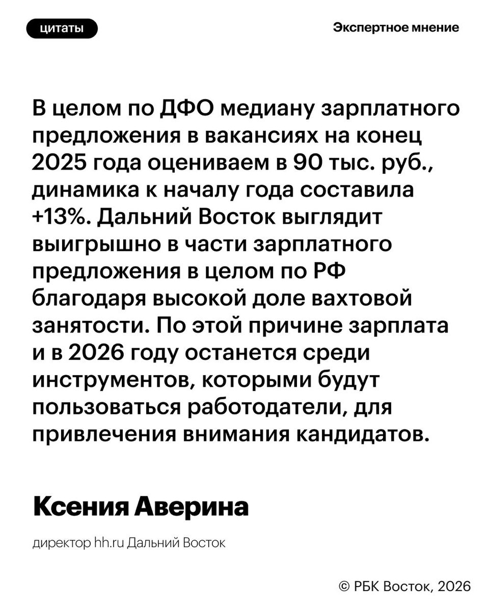 ? Рекрутинговый портал hh.ru специально для РБК Восток проанализировали тренды 2025 года и дали прогноз на 2026-й. Эксперты пришли к выводу, что на Дальнем Востоке отсутствуют предпосылки для развития «рынка работодателя» – кадровый запас пока остается ограниченным. Однако зарплатная гонка уходит в прошлое: массового повышения уже не будет. Подробнее – читайте в нашем материале 🔗 РБК Восток в Telegram и MAX