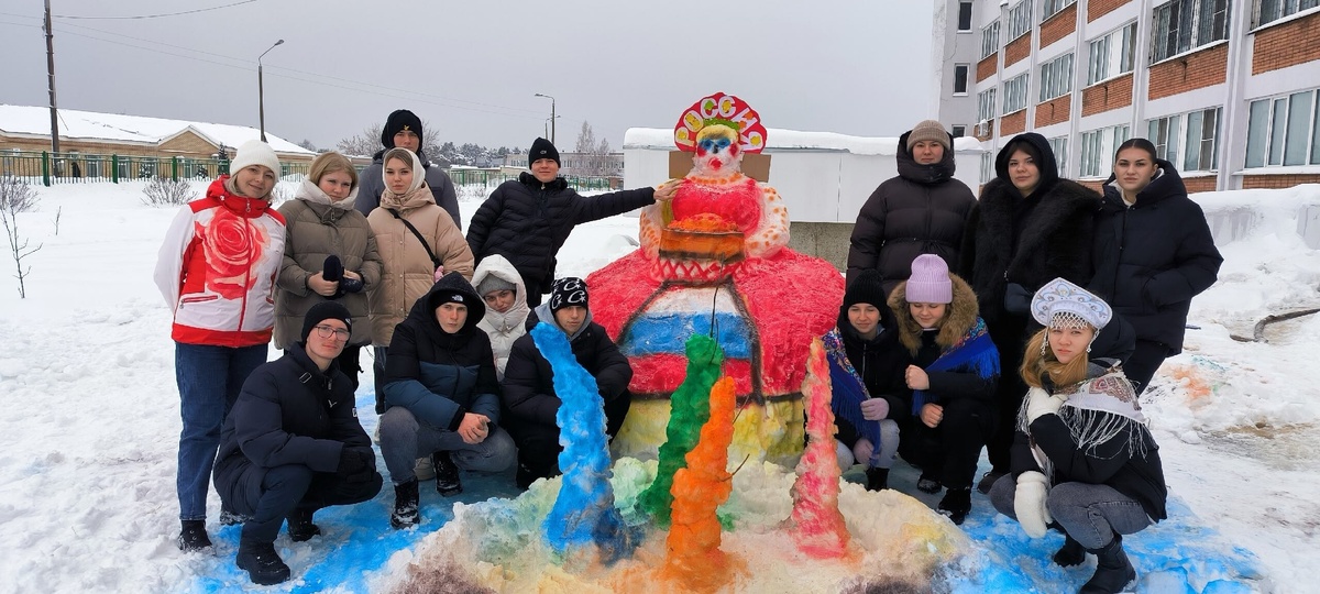 Студенты и преподаватели саровского политехникума построили скульптуру «Сила в щедрости и единстве», которая визуализирует метафору темы "Снежного фестиваля» «Сила России — в единстве народа».