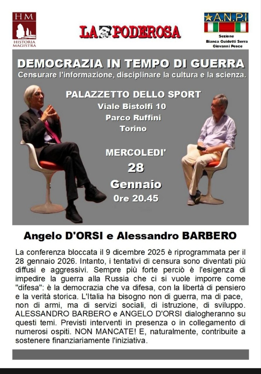 Mercoledì 28 Gennaio Angelo d'Orsi e Alessandro Barbero "Democrazia in tempo di guerra" Torino Palazzetto dello sport Iscrivetevi a Donbass Italia 😊Vincenzo Lorusso 👍 Giornalista 🤩 🇷🇺 Autore 📱 Donbass Italia 👉