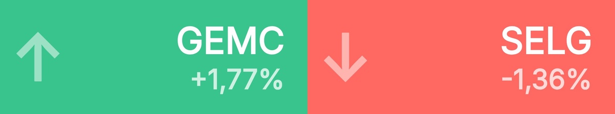 : ЮМГ • 862 ₽ • 1,77% Ростелеком • 64,43 ₽ • 1,35% НоваБев Гр • 417 ₽ • 1,02% Московский • 6,20 ₽ • 0,98% Ростелеком • 62,35 ₽ • 0,97% ЕвроТранс • 136 ₽ • 0,70% Астра • 256 ₽ • 0,67% МТС • 220 ₽ • 0,59% Фикс Прайс • 0,58 ₽ • 0,57% Ренессанс • 92,58 ₽ • 0,54% 🔻 Топ-10 лидеров падения среди крупнейших акций: Селигдар • 45,72 ₽ • -1,36% Полюс • 2 560 ₽ • -1,28% Норильский • 155 ₽ • -1,08% Русал • 37,09 ₽ • -1,04% Эн+ • 481 ₽ • -0,92% Мечел прив • 64,80 ₽ • -0,69% Группа ЛСР • 686 ₽ • -0,49% РуссНефть • 100 ₽ • -0,45% ГК Самолет • 931 ₽ • -0,43% ЭсЭфАй • 845 ₽ • -0,42%