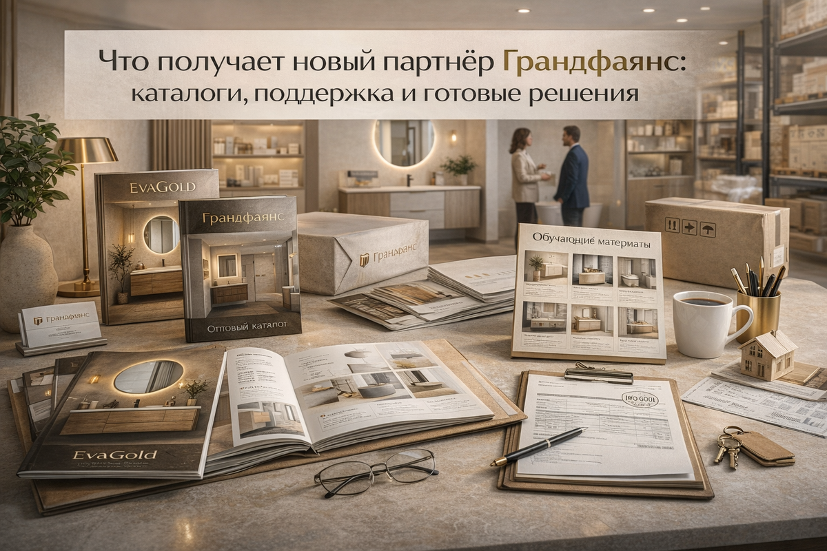 Именно по такому принципу выстраивает партнёрство компания Грандфаянс. Разберём, что получает новый партнёр на старте и почему это напрямую влияет на продажи и оборачиваемость. Партнёр получает не просто прайс, а структурированный оптовый каталог с актуальными линейками, в том числе мебелью и решениями EvaGold. В стартовый пакет входят: Почему это важно: Каталог становится инструментом продаж, а не просто перечнем товаров. Продавец легко ориентируется в линейке, а покупатель быстрее принимает решение. Грандфаянс работает с партнёрами не как «поставщик», а как участник продаж. В рамках партнёрства: Почему это критично: Правильная выкладка снижает «замороженные» остатки и повышает оборачиваемость без расширения площади. Даже сильный ассортимент не работает без надёжной логис
