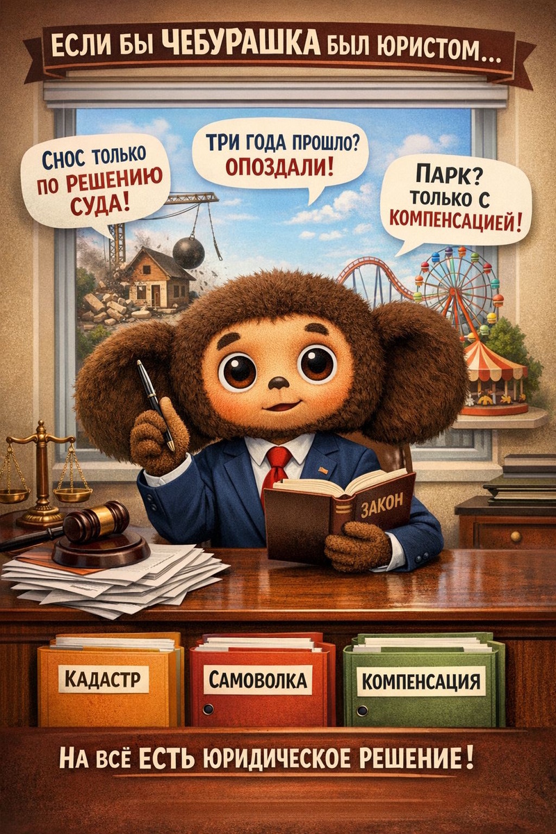 В фильме «Чебурашка 2» администрация объясняет необходимость сноса дома Гены весьма универсальным аргументом: при строительстве якобы была допущена кадастровая ошибка. Почти сразу добавляется второй мотив — на этом месте планируется парк развлечений. С точки зрения кино — логично. С точки зрения права — нет. Если бы Чебурашка окончил юрфак, он бы задал чиновникам несколько неудобных вопросов. Первое, что бросается в глаза юристу: администрация не вправе самостоятельно принять решение о сносе капитального объекта недвижимости — будь то жилой дом, мастерская, кафе или иной объект коммерческого назначения. Даже если здание действительно возведено с нарушениями, максимум, что может сделать орган власти, — обратиться в суд с иском о признании постройки самовольной и о её сносе. Решение о сносе — это всегда судебный акт, а не распоряжение чиновника. На практике таких дел — тысячи: по складам, торговым павильонам, гостиницам, производственным зданиям. И почти всегда ключевая роль принадлежит