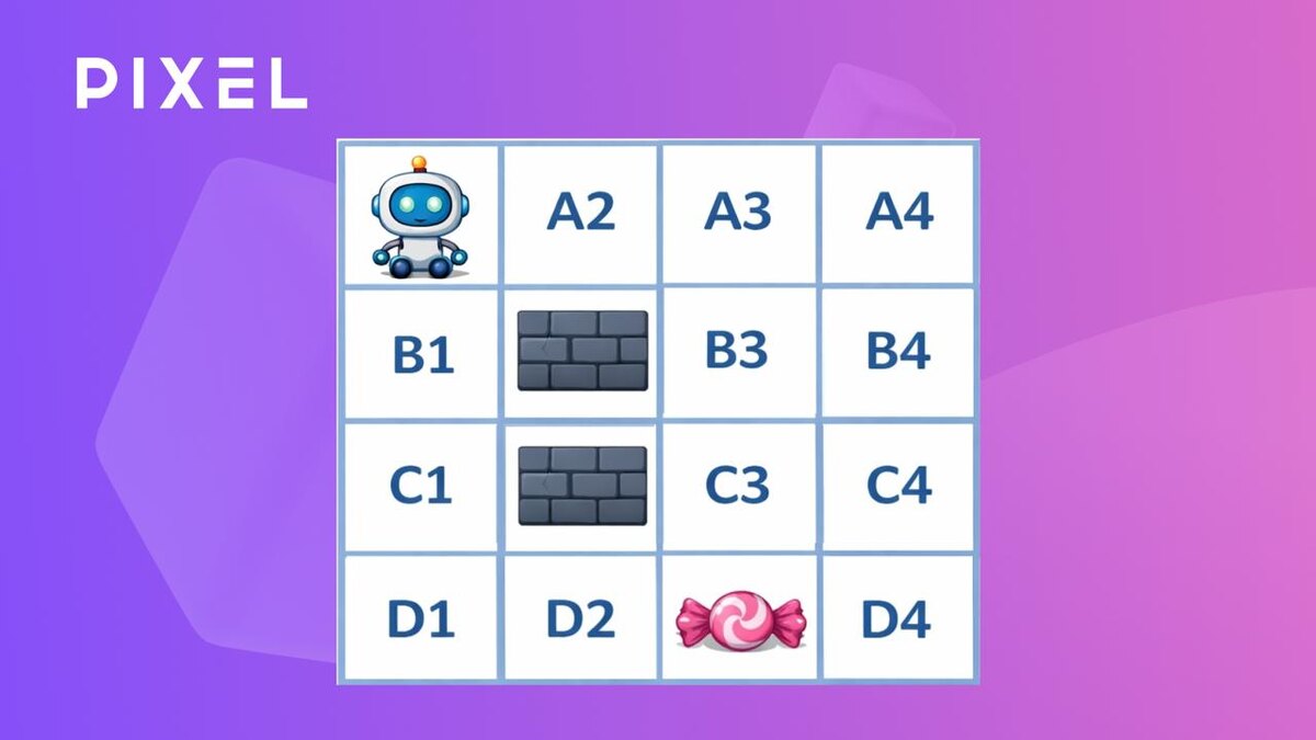 🤖 Он должен дойти до конфеты 🍬 по клеточкам. Условия: ✅ робот стартует в клетке A1 ✅ конфета лежит в клетке D3 ✅ за один шаг робот может идти только: вверх / вниз / влево / вправо ✅ через стенку ходить нельзя! Карта поля (4×4): A1 A2 A3 A4 B1 B2 B3 B4 C1 C2 C3 C4 D1 D2 D3 D4 🚧 Стены (туда нельзя): B2 и C2 🎯 ТВОЯ МИССИЯ: Напиши в комментариях маршрут робота (например: ➡️➡️⬆️⬆️➡️) А теперь усложнение: придумай самый короткий маршрут! ✨ Бонус для самых внимательных: Сколько разных маршрутов существует, если робот делает ровно 5 шагов? Пиши ответ в комментарии 👇