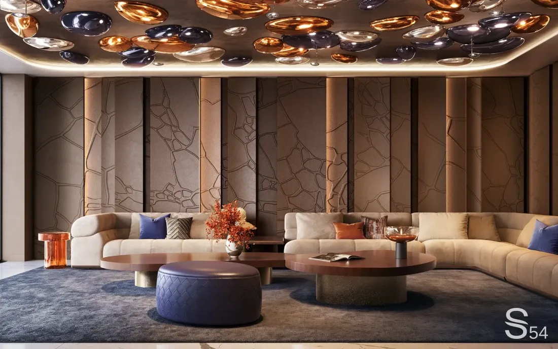 Этот проект стал для Studia 54 продолжением долгого творческого диалога с заказчиком. Ранее мы разработали архитектуру его частной резиденции в Калькутте площадью 1 500 м² и ландшафт на участке 20 соток. Финальным этапом стал интерьер — масштабный, статусный и глубоко символичный. Проект получил название Vastu of Light. Обсудить ваш проект с экспертом от Studia 54: WhatsApp +7 (931) 270-54-54 welcome@studia-54.ru Дом задумывался как гостевая резиденция для торжеств и приёма партнёров. Пространство рассчитано до 100 гостей одновременно, поэтому ключевыми задачами стали ощущение простора, цельность интерьера и эффект первого впечатления. Все решения выстраивались в рамках комплексного подхода: архитектура, интерьер и свет проектировались как единое целое с учётом принципов Васту — от ориентации помещений до сценариев жизни и атмосферы мероприятий. Первый этаж: пространство для приёмов