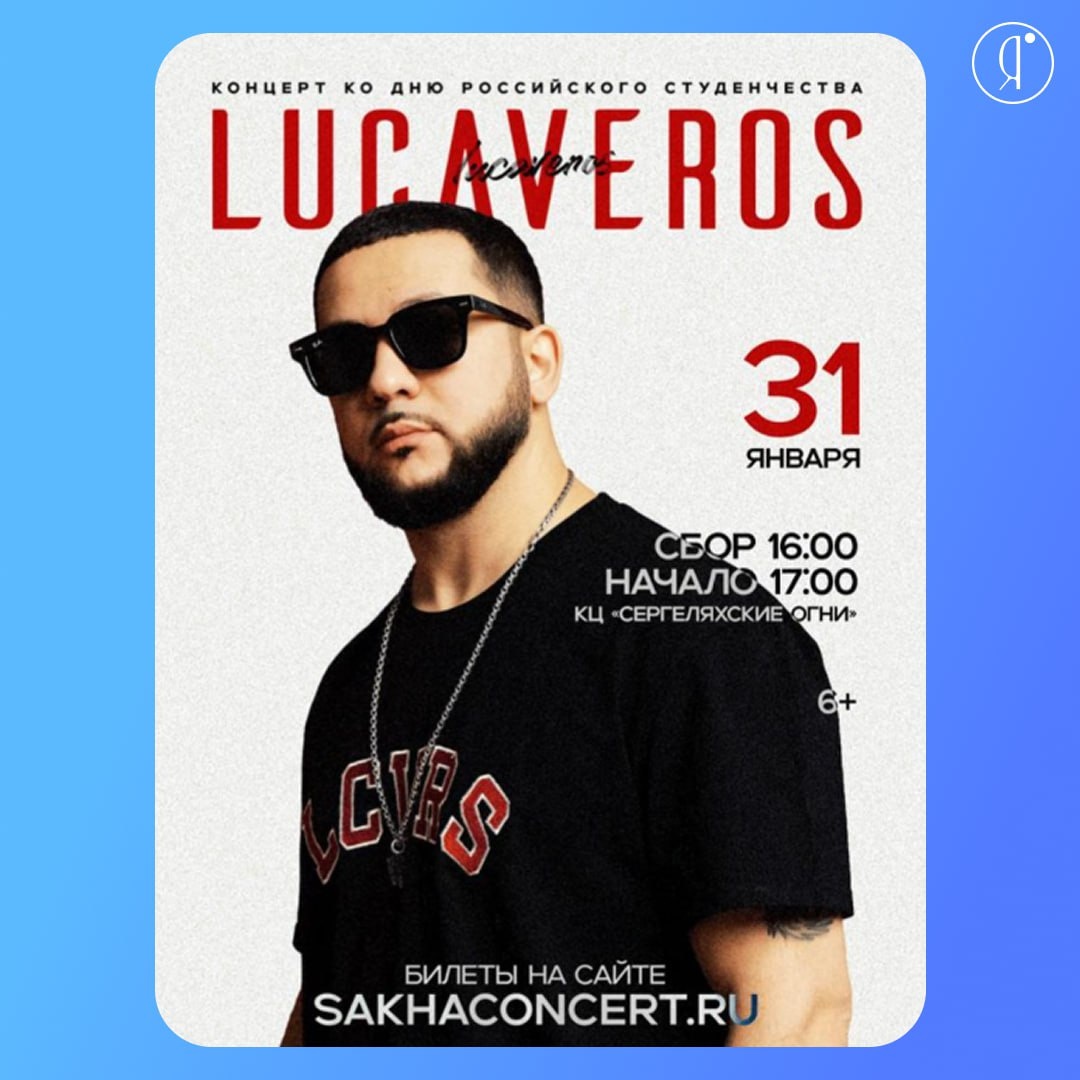 #Концерты Концерт ко Дню российского студенчества В программе: - знакомство с историей Татьяниного дня - вокальные и хореографические выступления артистов - выступления студенческих творческих коллективов Хэдлайнер вечера - легендарный LUCAVEROS 31 января | 17:00 КЦ «Сергеляхские огни», Белинского, 58а 1900-3500 руб. Подробнее Online Якутия | Ждем вас в МАХ