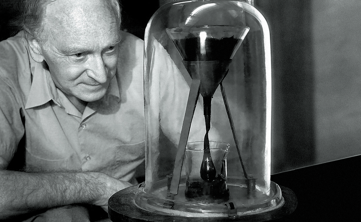 В мировой науке есть опыт, который живет дольше целого поколения, он стартовал в 1927 году в Брисбене (Австралия) и идёт с тех пор непрерывно, став рекордсменом по длительности среди лабораторных экспериментов. Его цель удивительно проста: показать, что битум - не твёрдое вещество а крайне вязкая жидкость, которая течет так медленно, что человеческому терпению приходится состязаться со временем. За прошедшие десятилетия образовалось девять капель, но ни один наблюдатель не увидел момент их отделения - в этом и скрыта интрига века. В 1927 году профессор Томас Парнелл из Квинслендского университета поместил кусок смолы в стеклянную воронку, слегка подогрел, чтобы осадить материал, а затем в 1930 году снял заглушку, с этого момента и начался отсчёт. Первая капля сформировалась и оборвалась к концу 1938, доказав, что битум течет, обладая вязкостью в 230 миллиардов раз выше чем у воды. После смерти ученого эстафету подхватили физики Джон Мэйнстон и позднее Эндрю Уайт. Капли фиксировались в