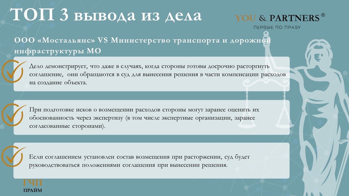 Команда You & Partners проанализировала решение Арбитражного суда Московской области по делу № А41-90195/22 🟢 Суть спора: ООО «Мостальянс» (концессионер) обратилось в суд с требованием досрочно расторгнуть концессионное соглашение (КС) №35 от 26.02.2018 с Министерством транспорта и дорожной инфраструктуры Московской области (концедент) и взыскать: -расходы на создание объекта в размере 51,7 млн руб; -стоимость обслуживания процентов по акционерным займам в размере 57,8 млн руб; -неустойку за несвоевременное предоставление земельных участков в размере 3,3 млн руб. Позиция сторон по делу. Концессионер: 🤚 Ссылался на нарушение ответчиком сроков предоставления земельных участков и получения результатов заключения государственной экспертизы, что препятствовало началу строительства. Концедент: 🤚Указывал, что концессионер не исполнил встречные обязательства: не представил согласованные схемы земельных участков и не обратился за их предоставлением в установленном порядке. Суд первой инстанц