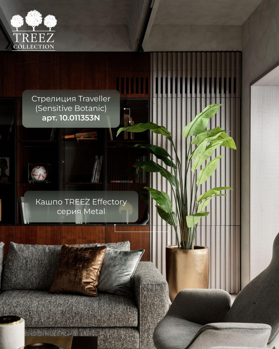 В проекте Елизаветы Куварзиной интерьер строится на четких линиях, графичных плоскостях и сдержанной палитре. Стрелиции TREEZ в кашпо коллекции TREEZ Effectory Metal усиливают вертикаль, подчеркивают глубину темного дерева и добавляют живой ритм в строгую архитектуру офиса. Особенно эффектно коллекция кашпо Effectory Metal раскрывается в лаковом исполнении: плотный блеск, ровная геометрия и игра со светом – настоящий арт-объект в рабочем пространстве. Создавайте лучшее озеленение с TREEZ 🌱 Стилист: Анна Бабенко