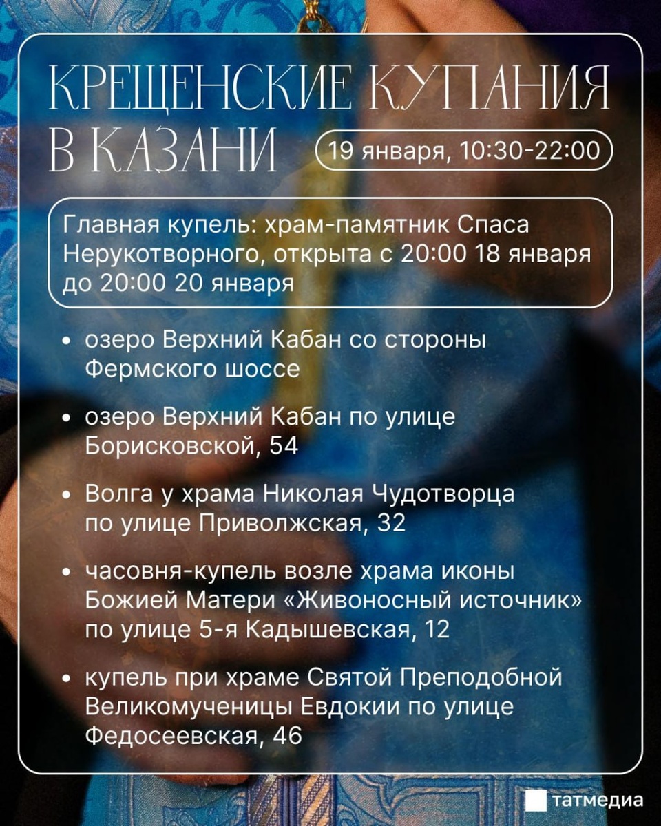 ☦️🌊 Совсем скоро в Казани пройдут крещенские купания 19 января в храмах города пройдут праздничные богослужения. Для участников организуют раздевалки, горячий чай и дежурство спасателей, медиков и полицейских. Места купелей - в посте. @tatmediaofficial | Все каналы Татмедиа ™️ 1-й новостной MAX-канал Татарстана - подпишитесь.