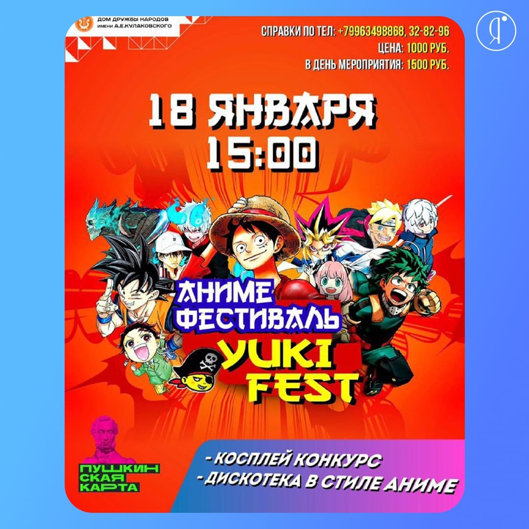 » #ВГороде «Yuki Fest» - это открытый молодёжный фестиваль, объединяющий поклонников косплея, танцев и музыки, анимации и манги, графических новел и комиксов, популярного искусства. Косплей-фестиваль – это яркое красочное мероприятие, на котором можно встретить сотни людей в костюмах, изображающих персонажей ваших любимых фильмов, мультфильмов, комиксов и игр. В обширной конкурсной программе, включающей в себя разнообразные выступления, они поборются за приз лучшего в своей номинации, а также за гран-при фестиваля - «Лучший Костюм Yuki Fest-2026!» 18 января | 15:00 ДДН им. АЕ Кулаковского, Дзержинского, 13 1000 руб. Подробнее на ddn-afisha.ru Online Якутия | Ждем вас в МАХ