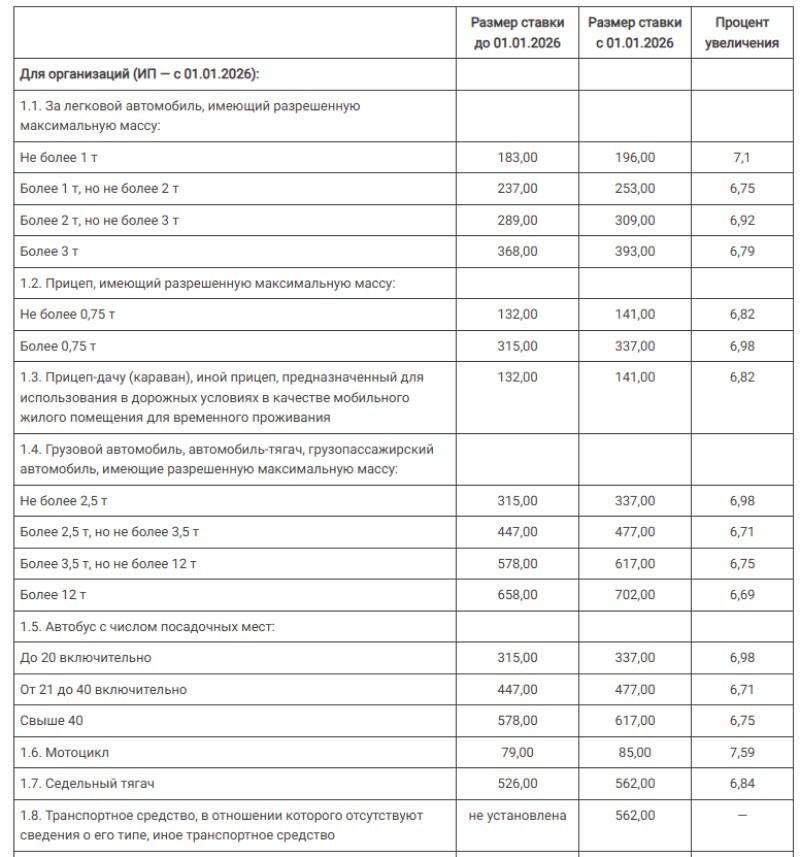 Ставки транспортного налога для индивидуальных предпринимателей в Беларуси с 1 января 2026 года стали такими же, как и для организаций. Об этом напомнил портал ilex.by. Скриншоты здесь и далее: ilex.by Прежде ставки для ИП находились на уровне сумм для физических лиц. Физлицам, в том числе зарегистрированным в качестве ИП, транспортный налог исчисляют налоговые органы. Суммы за 2026-й укажут в извещениях, которые направят плательщикам не позднее 1 октября 2027 года. Налог подлежит уплате не позднее 15 ноября 2027-го. Перечислим вкратце и другие новшества транспортного налога: 1. Все ставки для организаций и физических лиц проиндексированы в среднем на 6,95% (см. скриншоты выше). 2. Для организаций введены отдельные ставки транспортного налога за иные транспортные средства, за ТС, сведения о типе которого отсутствуют (562 руб.). 3. Для техники категорий L3, L4, L5 (мотоциклы, мотороллеры, трициклы) с рабочим объёмом двигателя 800 куб. см и более, с года выпуска которой не прошло пяти ле